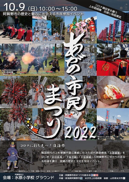 阿賀野市民まつりを創る会(所在地:新潟県阿賀野市/会長:高橋裕)は、「あがの市民まつり2022」を、2022年10月9日(日)10:00~15:00、阿賀野市 水原小学校 グラウンドで開催します。阿賀野市にゆかりのある戦国時代の上杉景勝や直江兼続に仕えた初代鉄砲隊長「水原親憲(すいばらちかのり)をはじめ「安田長秀(やすだながひで)」「下条忠親(げじょうただちか)」「千坂景親(ちさかかげちか)」ら名将達を讃え、故郷の歴史と文化を知る祭りイベントです。(入場無料)