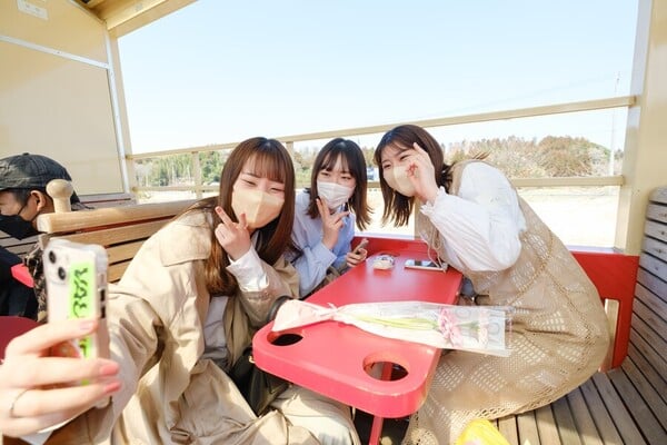 春爛漫の里山を駆け抜けるショートトリップのはじまり。仲間との久々の再会に高まる気持ちを抑えつつ、出発の時を待ちましょう。特製ヘッドマークにも注目です!出発したら、特製ノンアルコールドリンク「いちはらシャンパン」で乾杯!市民の皆さんから寄付頂いたシャンパングラスを使用しています!