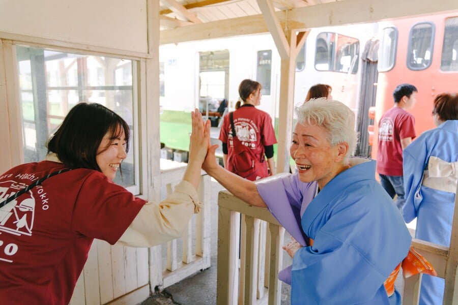 続いての停車駅は里見駅。ここでは「鶴舞踊りの会」の皆さんが踊りでお出迎え。「民謡なんて…」と侮ることなかれ。一緒に体を動かすと、気分転換になりますよ!