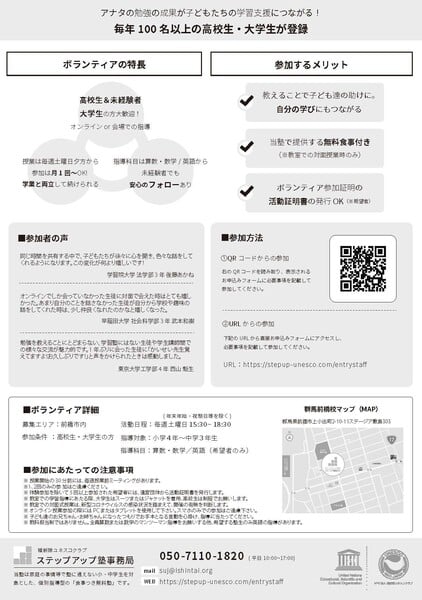 教育格差是正を目的に活動を続ける当塾は、日本ユネスコ協会連盟との提携のもと都内二ヶ所・高知県高知市と福岡県北九州市(FC)そして前橋で教室を開室しており、現地指導可能な学生を随時募集しています。