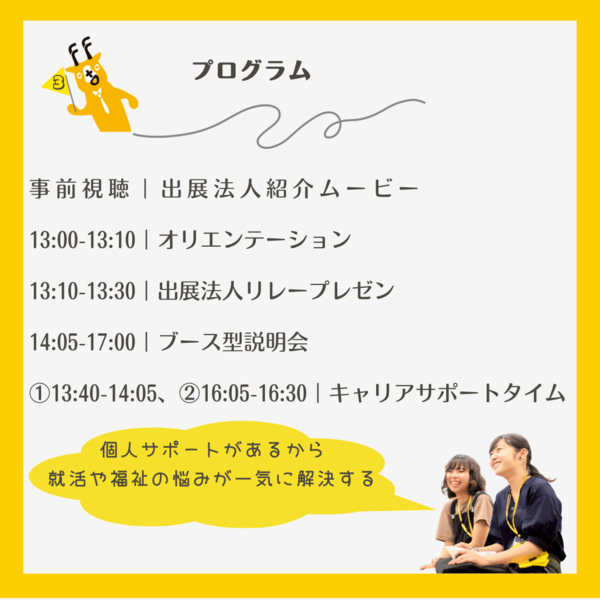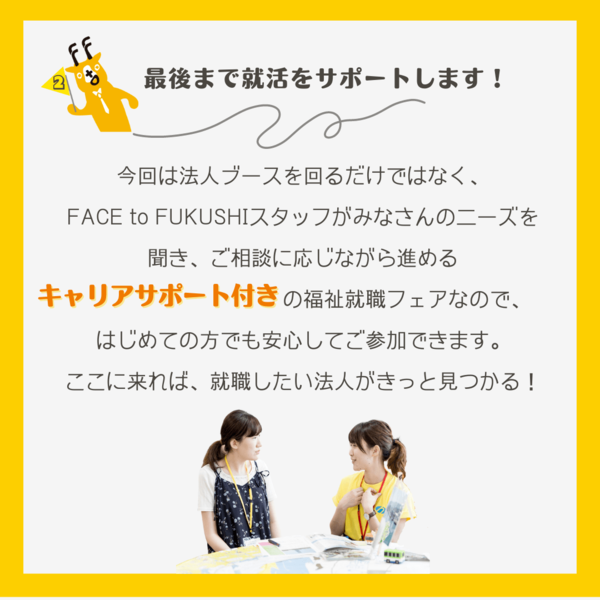 今回は法人ブースを回るだけではなく、FACE to FUKUSHIスタッフがみなさんのニーズを聞き、ご相談に応じながら進めるキャリアサポート付きの福祉就職フェアなので、はじめての方でも安心してご参加できます。