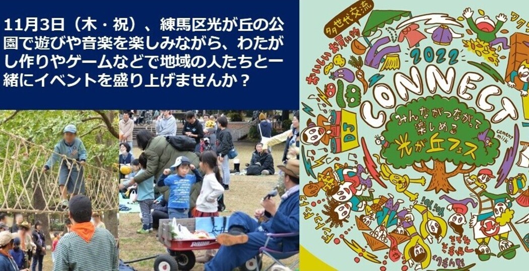 11月3日(木・祝)練馬区光が丘地域のみんながつながって楽しめるフェス"CONNECT2022"の当日ボランティア募集です!夏の雲公園で地域の保護者たちと一緒にお祭りを楽しく盛り上げましょう!