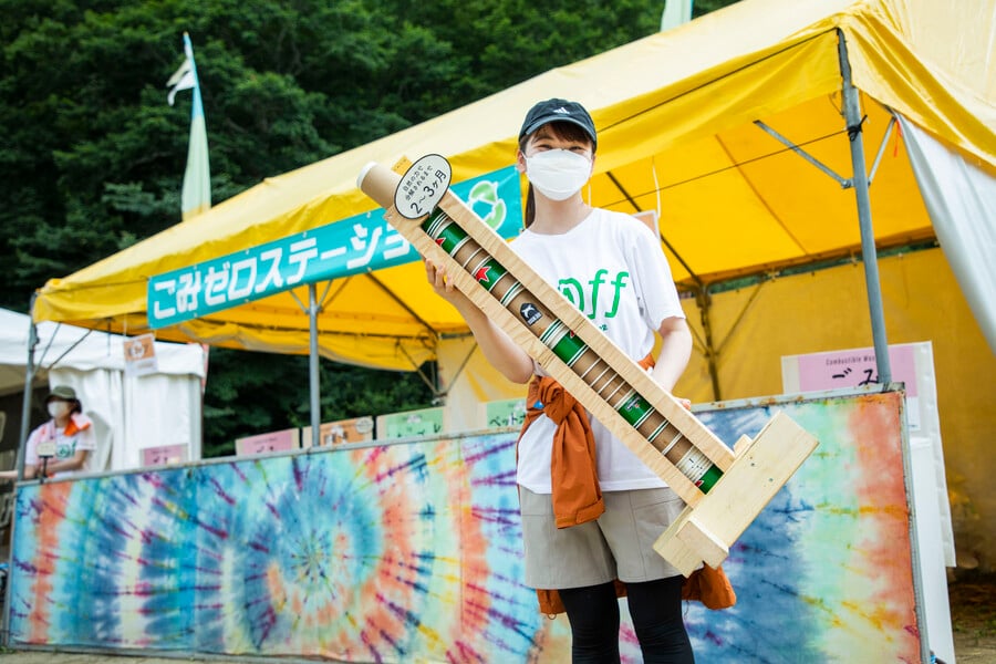 会場内に大きなごみ箱を立てて来場者に分別を促す活動や、リユース食器の導入、キャンペーンブース展開などを行い、イベントの環境負荷を下げるとともに、来場者に環境問題に目を向けるきっかけを届けています。