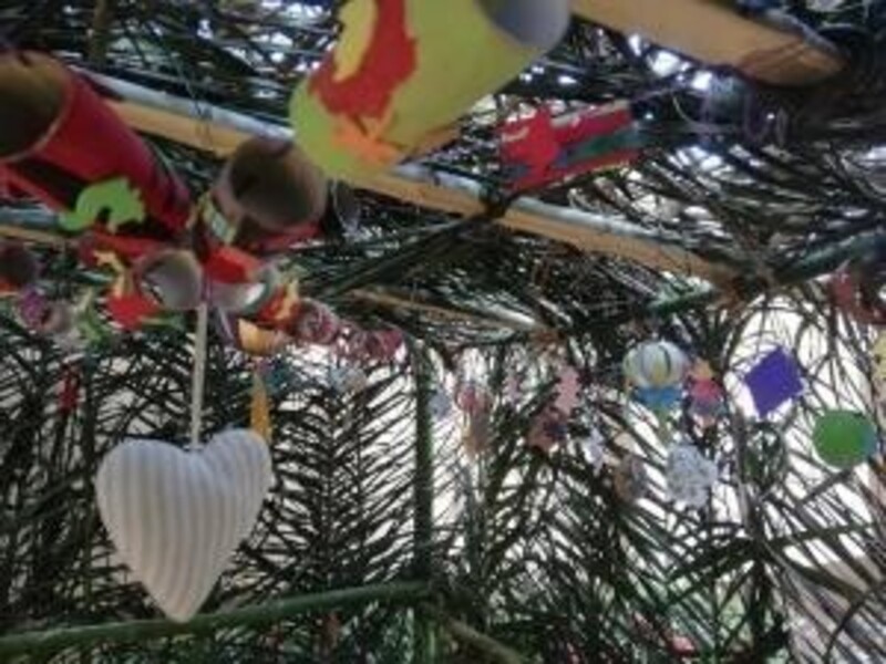 ・藁を使ったクリスマス小屋の設置。飾り台、クリスマスツリーの設置。