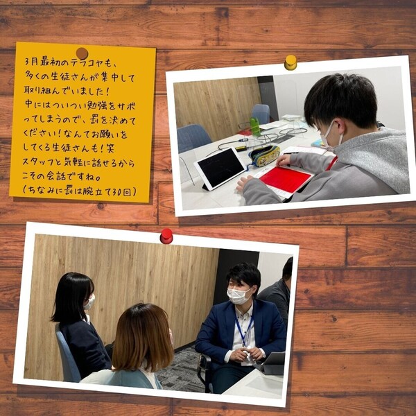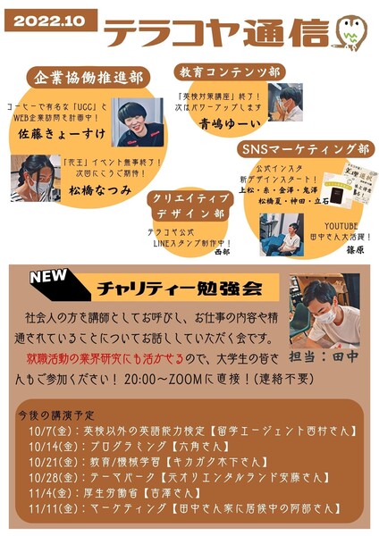 スタッフの雰囲気:皆さん意欲がとても高いです!「とにかく勉強を教えたい!」だけでなく、「企業にテラコヤをPRする!」「公式インスタの投稿を担当する!」。そして今回の「Youtube編集に関わる」など。