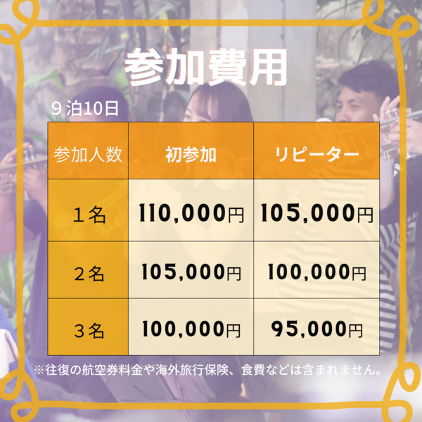 現地での宿泊費や交通費などが含まれます。往復の航空券海外旅行保険、食費などは含まれません。