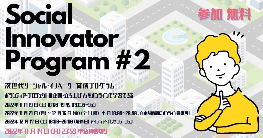 次世代ソーシャルイノベーター養成プログラム(Next SIP)は、さまざまな社会課題の解決に取り組む若者(高校生ー大学生、おおむね24歳まで)を対象として、企画力・リーダーシップ・会計の基礎知識・活動計画書の書き方など市民活動のマネイジメントに必要不可欠な能力を1か月で学習する人材育成プログラムです。