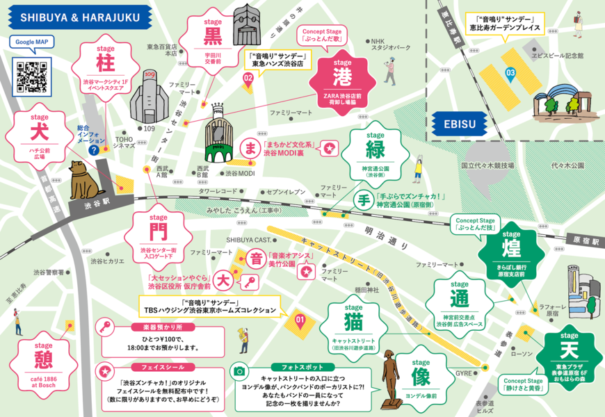 ハチ公前や、センター街や、宇田川交番前、神宮前交差点など、渋谷のいたるところにステージをつくったり、