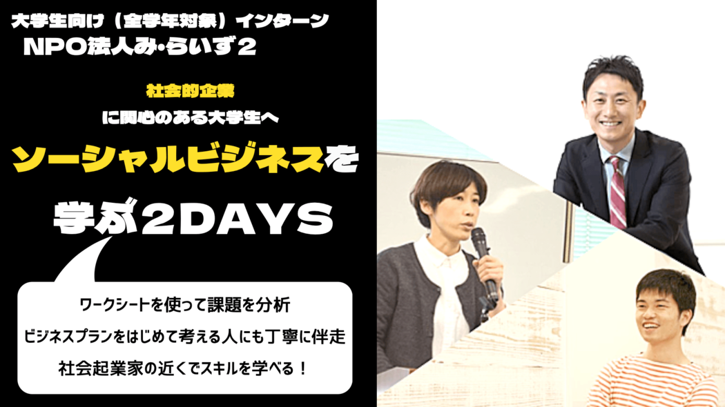 - 【全学年対象】社会的企業に関心のある大学生へソーシャルビジネスを学ぶ2DAYS