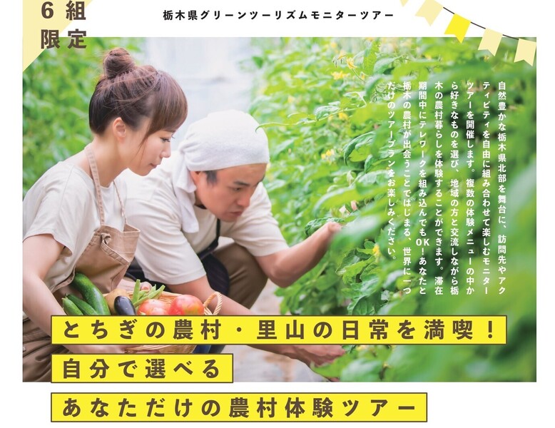 自然豊かな栃木県北部を舞台に、訪問先やアクティビティを自由に組み合わせて楽しむモニターツアー参加者を募集します!首都圏からのアクセスのよい栃木県で、農村の日常を体験しよう!