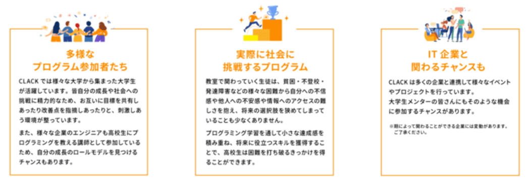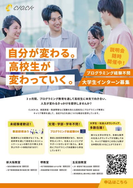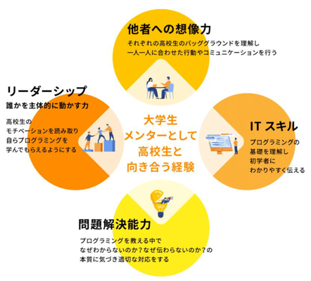 ãããªé«æ ¡çããããã°ã©ãã³ã°æå®€ã§ã®ä¿¡é Œã§ãã倧åŠçã倧人ãšã®é¢ãããéããŠãèªåèªèº«ãèŠã€ããå°æ¥ã«å¯Ÿãååãã«ãªããããã°ã©ãã³ã°ãåŠãã éææããã®æè¡ãããèªä¿¡ãæã£ãŠç€ŸäŒã«åºãããããã«ãªãã
