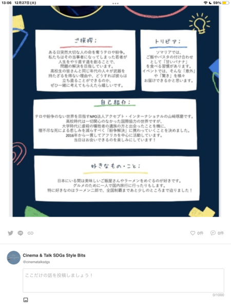 現役、高校生、大学生等学生を中心に「SDGs17パートナーシップで目標を達成しよう」の呼びかけのもとに問題解決のヒントや今日からできる事を日々の暮らしを丁寧に大切にできる時間をつくりだします。
