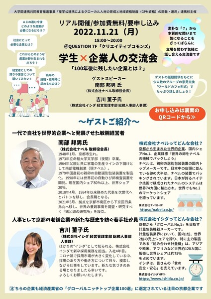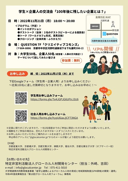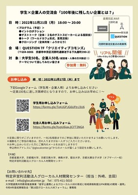 今年度で10年目を迎える毎年恒例の京都の大学生によるPBLの成果報告会『第10回グローカル人材フォーラム』の開催(2月)に先立ち、今年も≪2022年11月21日≫に学生×企業人の交流会『100年後に残したい企業とは?』を実施いたします。