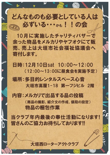 事前に集めた物品をメルカリやヤフオクにて販売、売上は大垣市へ寄付します。