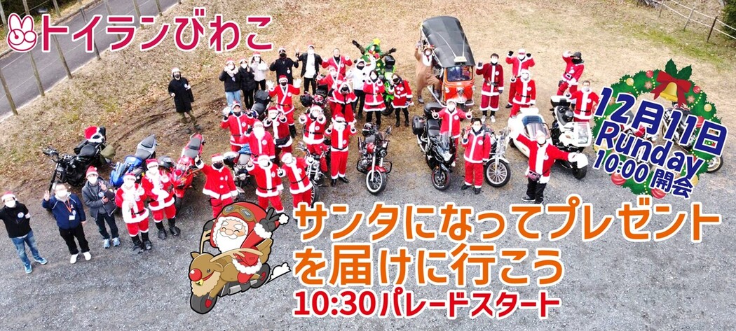 12月11日(日)滋賀県野洲市、守山市にて「トイランびわこ」を開催します。ライダーがクリスマスコスチュームで児童養護施設へパレードする素敵なイベントのボランティアカメラマン募集です。経験者大歓迎!