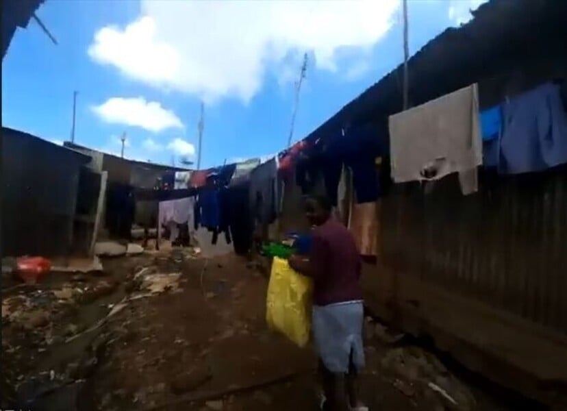【写真上】早速、食材や衛生用品を買いに出かけます。黄色いエコバッグを持って、スラムの中にあるキオスクに向かいます!中継では、スラムの細い路地を抜けて、お店に向かうところを見ていきます(5分)。