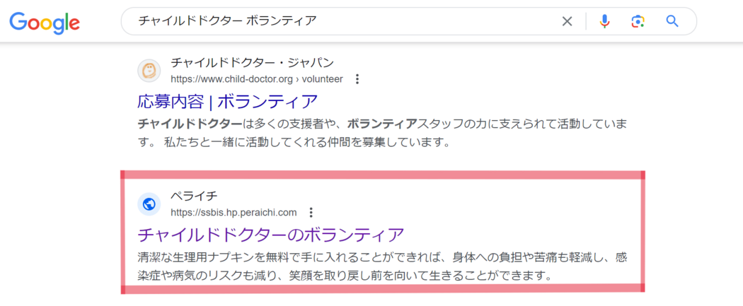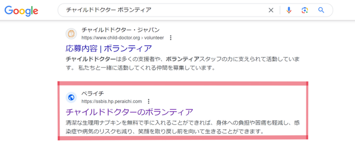 ①Googleから【チャイルドドクター ボランティア】と入力していただくと下記の検索結果が出てきます。