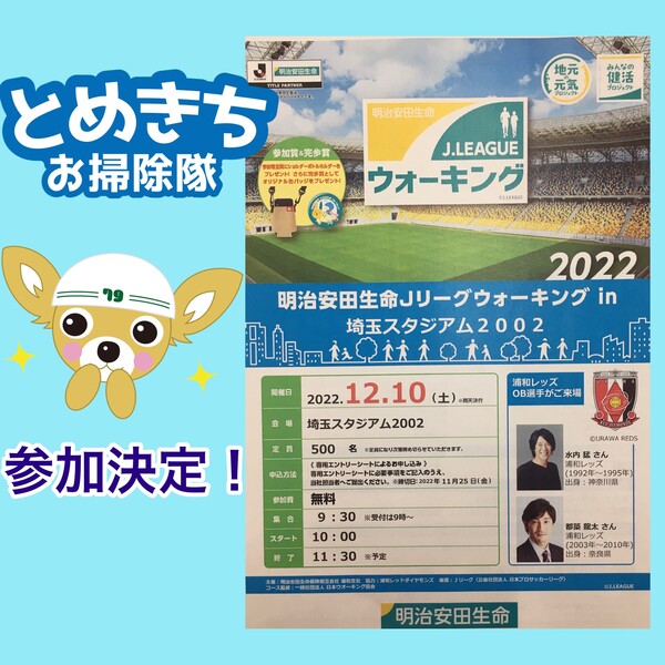 12/10(土)「明治安田生命Jリーグウォーキングin埼玉スタジアム」に「とめきちお掃除隊」が参加します。一緒にウォーキング参加してボランティア清掃しませんか?