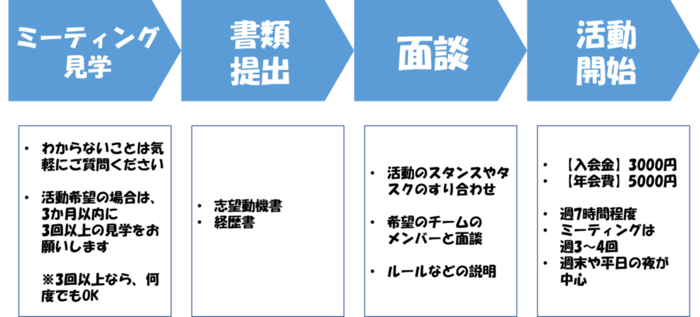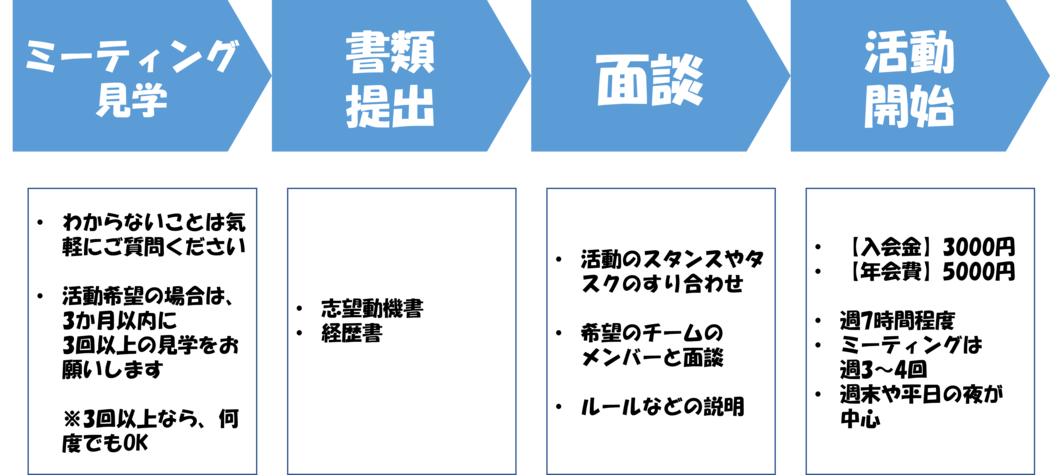 上記の2つの活動と、バックオフィス業務を含めて、ミーティングの見学を通じて担当の希望をご検討いただきます。ご経験に関わらず、ご希望があれば担当をお任せしています。