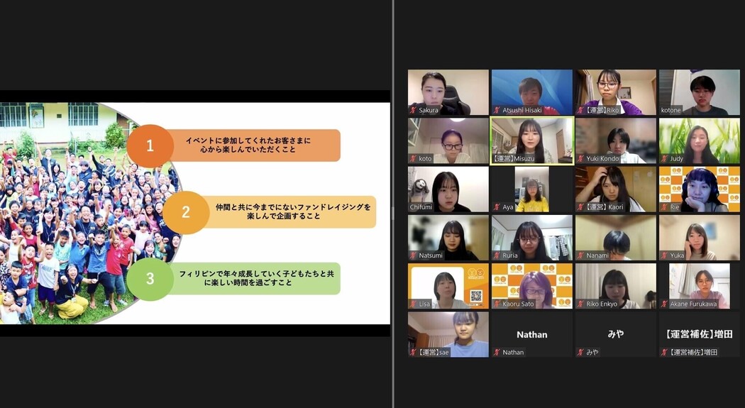 【20年間継続中】様々なバックグラウンドを持った社会人・学生メンバーでイベント企画・運営!(対面/オンライン)参加者の「笑顔」で得た収益をフィリピンの子どもたちへ寄付し、「笑顔」の連鎖を作りませんか?