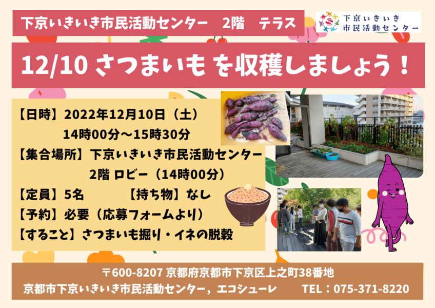 - さつまいもの収穫&イネの脱穀体験(持ち帰りOK):下京いきセン 12/10(土)