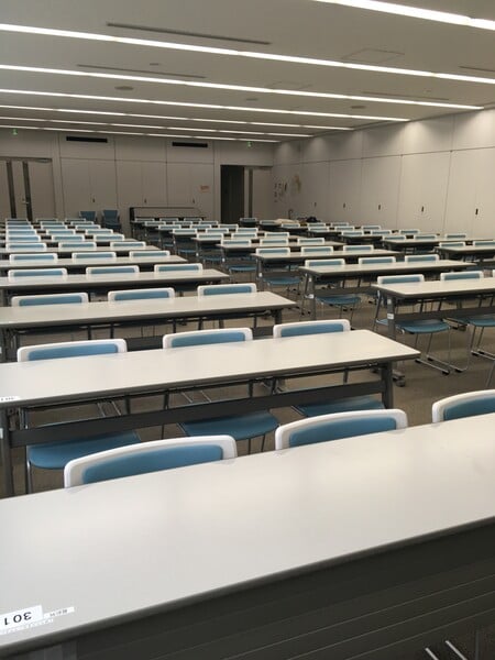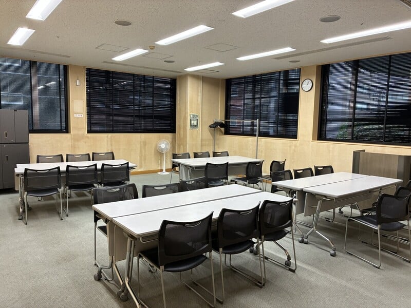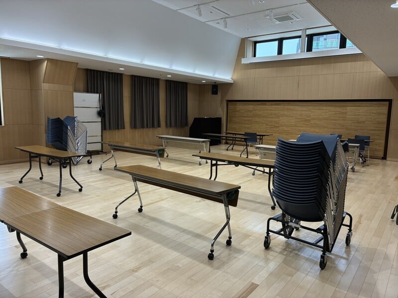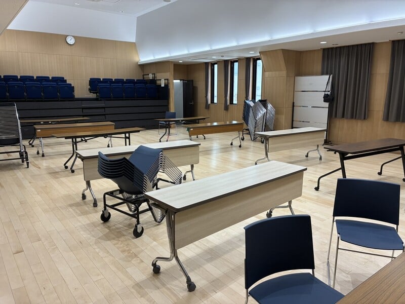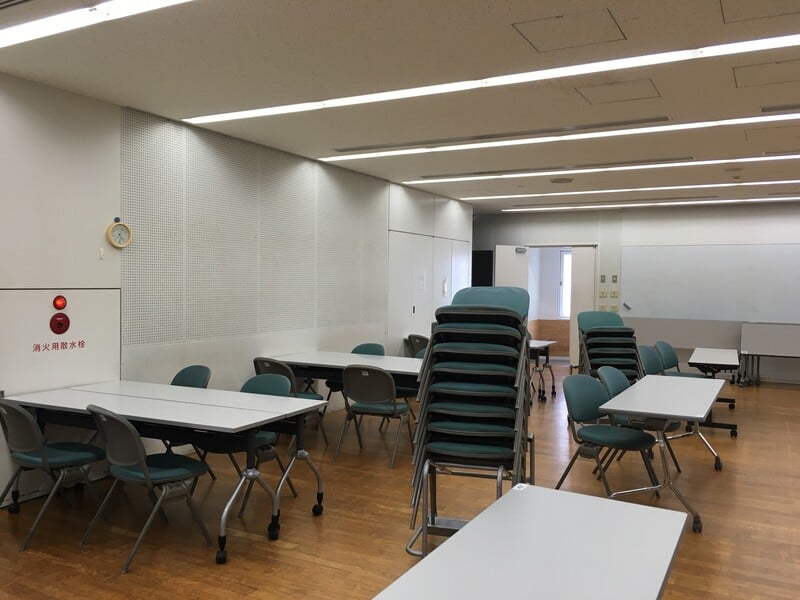 (2025年3月まで使用施設のものです)部屋によっては机と椅子を倉庫から出しての会場設営が必要です。会場設営は1時から始めます。