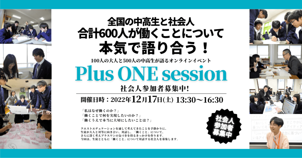 全国の中高生と働く大人が、「働くこと」をテーマにしたオンラインイベントPlus ONE Sessionを開催します。