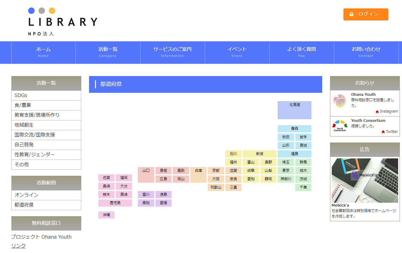 都道府県や活動ジャンルなどで団体を検索することが可能です。