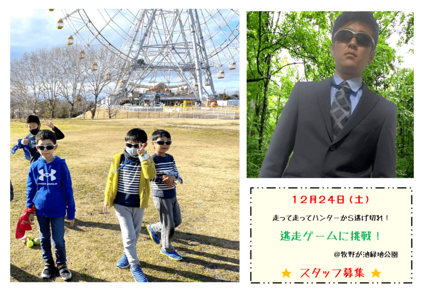 スーツとサングラスを装備し、テレビでよく見るハンターになりきって逃げる子どもたちを追いかけていただきます!