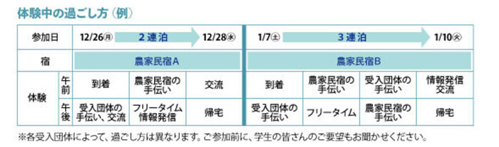 1週間~1ヶ月間 令和5年2月28日まで実施しています。ご応募の際に、希望する受入先・日程をお知らせ下さい。大学生、留学生、専門学生は5日以上(5泊以上)、高校生は2日以上(2泊以上)滞在可能な方限定です。ただし、5泊(高校生は2泊)連泊する必要はありません。また、同じ受入団体が提供する宿泊先であれば、途中で宿泊先を変更しても構いません。 |