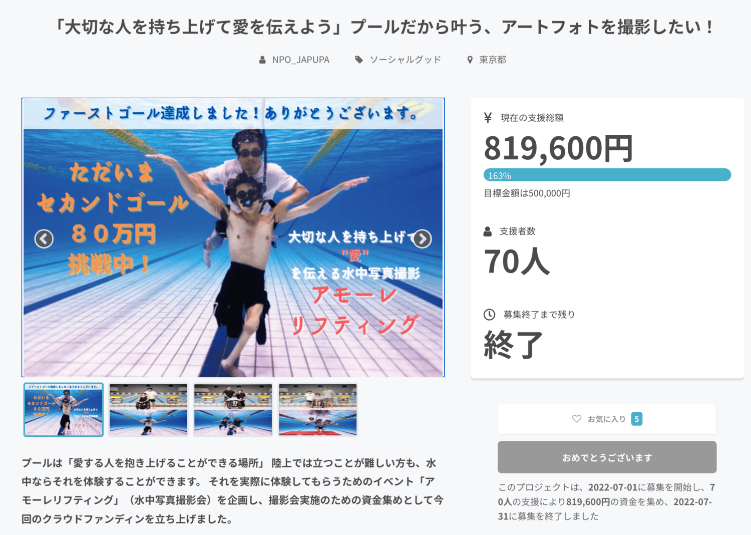水中写真撮影&展示イベント「アモーレリフティング」実施のためのクラウドファンディン実施。
