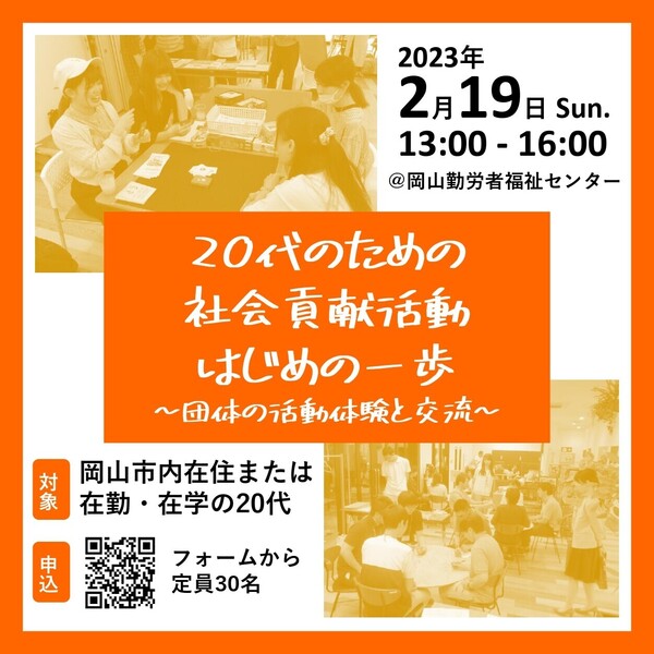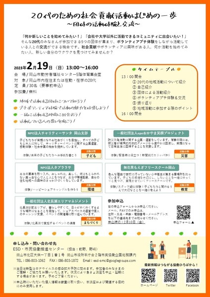 20代のみなさんが参加できる5つの団体が集まり、ボランティアプチ体験をしながら活動している人との交流ができる機会です。会社や大学以外に活動できるコミュニティを見つけてみませんか?