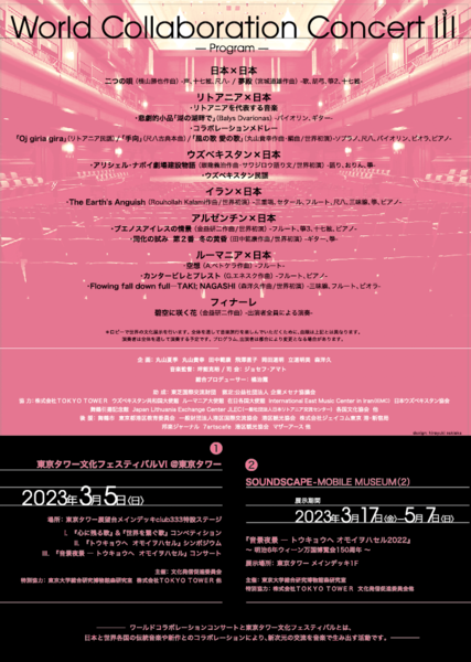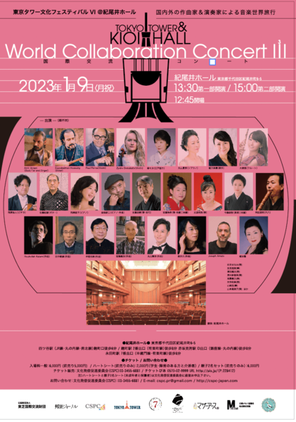 文化発信促進委員会(CSPC)は、相互方向の文化交流クリエイション(音楽や美術)を行い、2016年から東京タワー文化フェスティバルを毎年開催し、国内外で再演してきました。 World Collaboration Concertは、紀尾井ホールという音響のよいホールで、ハイクオリティな音と創造のコラボレーションを行うために企画しました。私たちの考える創造とは、異なる文化の価値を相互に理解することから始まります。演奏家・ディレクター・音楽監督・作曲家などが真剣にタッグを組み、同じ志の中、選曲・アレンジ・新作を検討しプログラムを決めました。このプログラムは、世界中に日本の伝統〜現代までの音楽文化を伝えるだけでなく、各国の音楽や文化と対話しながらトレンディーな音楽ショーとして進行します。ここだけでしか聴くことのできない貴重な"世界の一流奏者による特別編成の共演や競演"はこのコンサートの最大の聴きどころです。