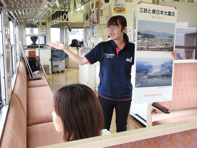 三陸鉄道社員または沿線住民が車内で震災の状況などをご案内。
