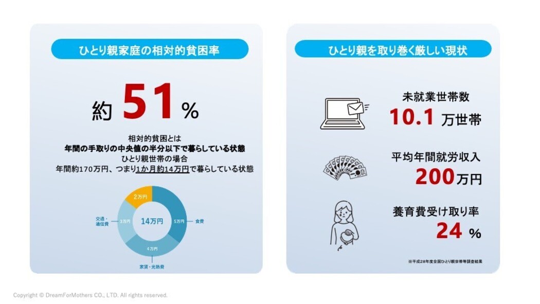 現実問題として、以下のような厳しい状況の中で、ひとり親家庭は苦しんでいます。