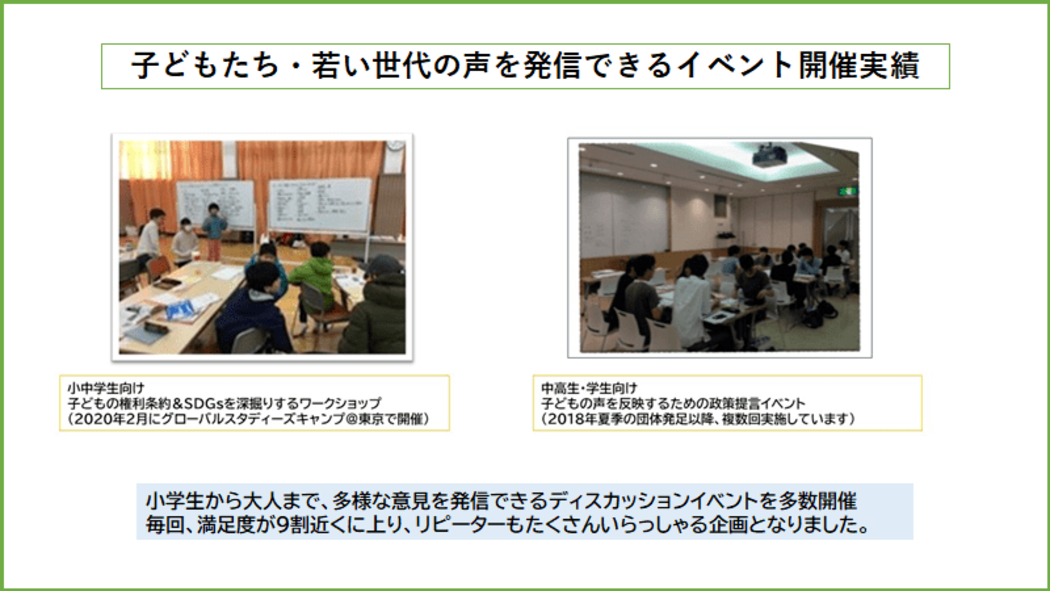 - 子どもたち・若い世代の声を反映することを目指した政策提言や企画実現と、