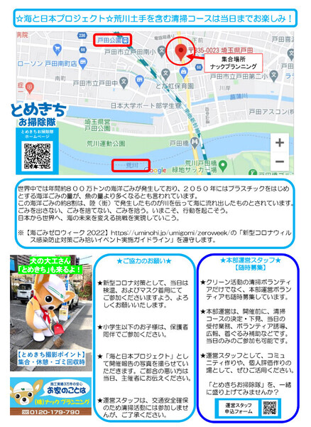 「とめきちお掃除隊」は、海と日本プロジェクトの一環として、犬の大工さん「とめきち」がお掃除隊隊長となり、NPO法人・企業・地域団体が協働で、多世代のボランティアとともに、戸田市で荒川土手の清掃活動、さいたま市浦和区では文化の小径マップを活用し、街巡りしながら清掃します。地域のコミュニティを繋げ、街の魅力を発信しながら、清掃活動を実施することで、街づくりに貢献することをめざすプロジェクトです。