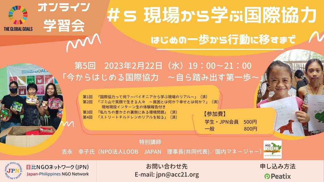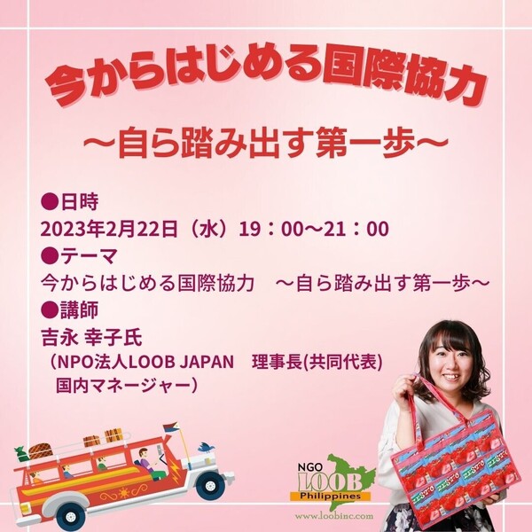 2/22(水)19時からオンライン開催。国際協力や一歩を踏み出すことをテーマに、吉永 幸子氏(NPO法人LOOB JAPAN)を講師にお呼びしています。