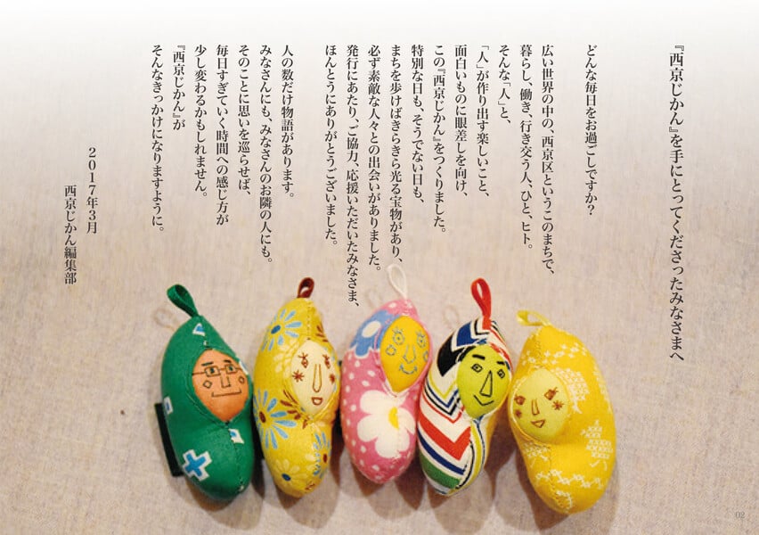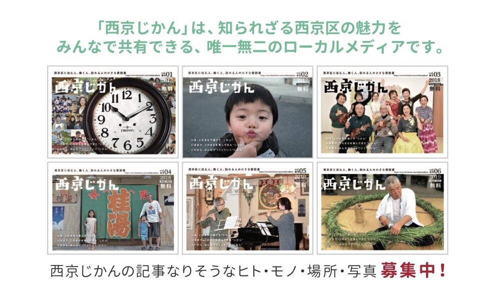 「西京じかん」は、読者にとって1番身近な「西京区」のおもしろいこと・すてきなこと・ものとそれに携わる人の紹介をします。