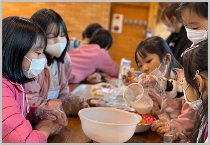【お菓子作り】ホットケーキやクッキー、ドーナツ、ポップコーンなど作りたいものを考えてこども達が中心になって作るので、作り方を教えたり、ケガをしないように見守ります。