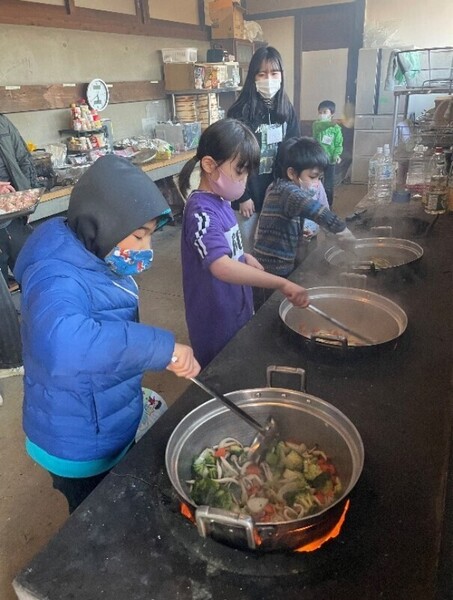 【炊事・片付け】こどもと一緒に行う野外炊飯以外にも、スタッフだけで食事を用意する時があります。長期スタッフの料理係を中心に2~4人で食事の準備をしてもらいます。