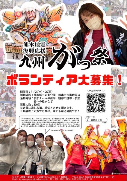 九州がっ祭は熊本地震からの復興を目指し、祭りが「きっかけ」となり熊本が盛り上がること、また九州が活性化することを目的に熊本の学生が中心となり、全国各地からお祭り団体を募集し、祭りを開催致します。