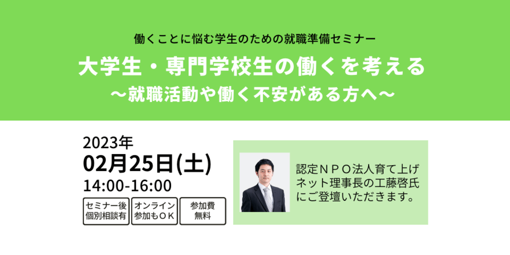 - 【セミナー】大学生・専門学校生の働くを考える ~就職活動や働く不安がある方へ~