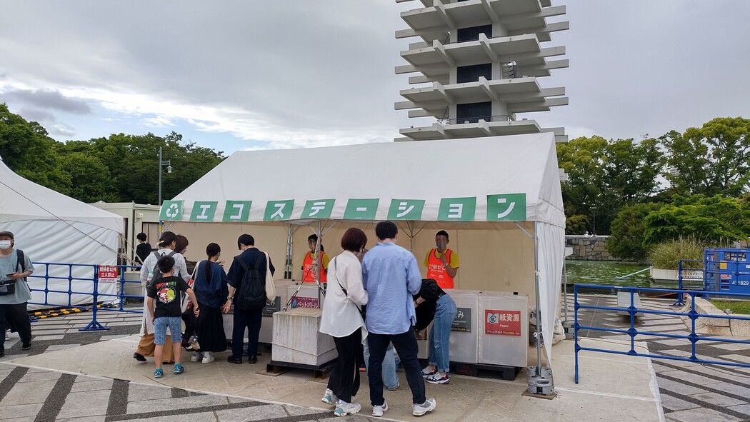 ごみ・資源の分別ナビゲート/資源回収とリサイクルごみ箱の前に立ち、ごみを捨てにきた来場者に対して分別を呼びかけます。ごみ箱の袋が一杯になったら袋を交換したり、一杯になった袋を集積所まで運んだりします。