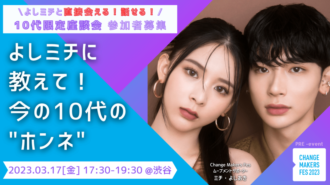 子ども・若者が人や環境を考えて行動することはカッコよくて当たり前だという社会に変えていくChange Makers Fesを応援してくれている2人と、今の10代の"ホンネ"を話し合う座談会を開催します。
