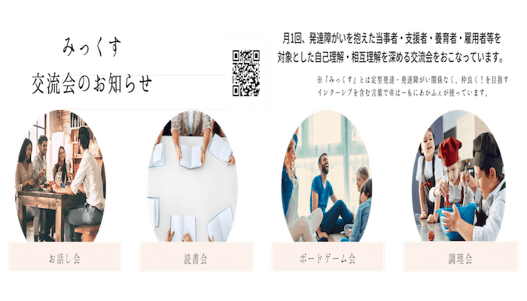 ① 発達障がいを抱えた当事者、支援者、養育者、雇用者等を対象とした交流会、自己理解・相互理解を深めるオープンダイアログ等によるワークショップの開催事業