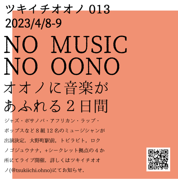 4月のテーマは「NO MUSIC NO OONO!」音楽のあふれる2日間,いっしょにライブイベントを創り上げませんか?
