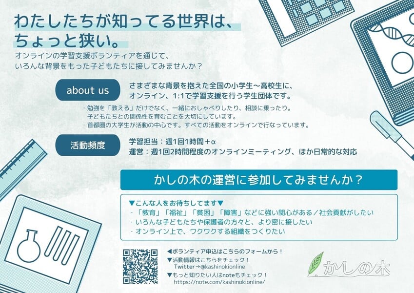 コロナ禍の東大で知り合い、オンラインでの支援活動ができないかと考え、発起人10人を集め、2020年7月に「かしの木」を発足。