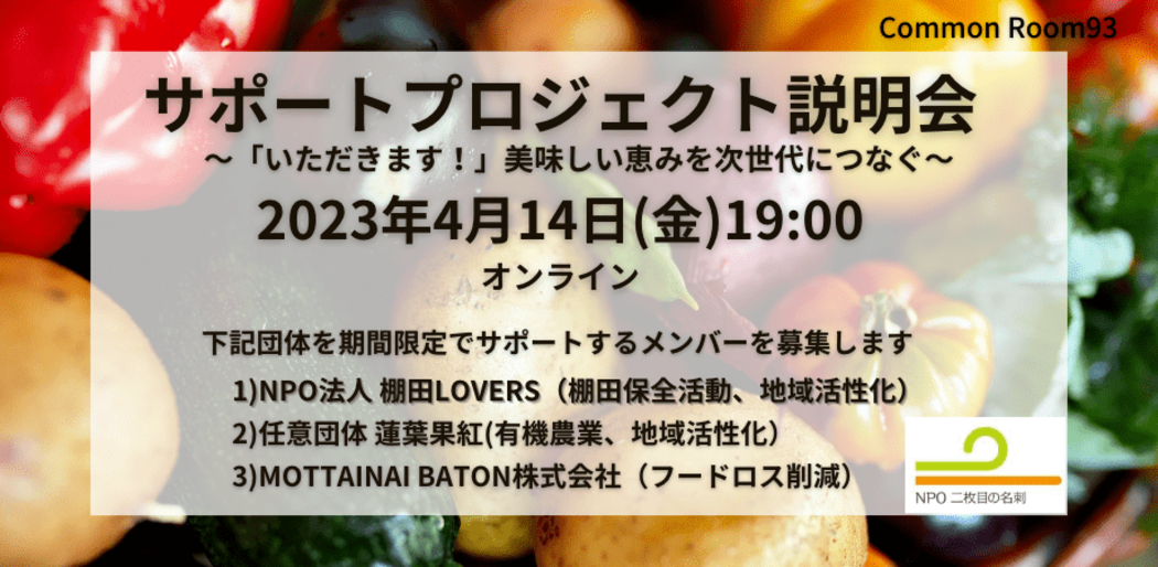 23年4月14日 19:00-21:00 のCommonRoom93(説明会)に参加いただき、団体のお話をお聞きください。そこで共感した団体と一緒にプロジェクト(3ケ月)がスタートします。 |