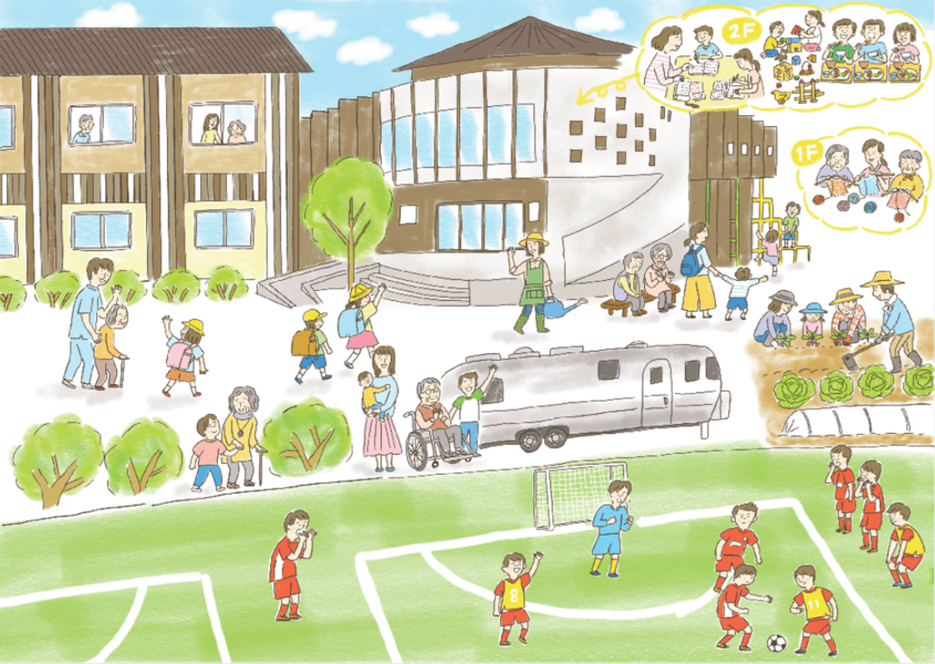 併設の「デイサービスセンターあかね雲」の高齢者の方をはじめ、「杉の子kidsもばら」の子ども達隣接の「ファミリークラブあかね雲」や「房総ローヴァ―ズ木更津FC」のフットサルコート利用者など、人と地域とのつながりを大切に子どもから高齢者まで、ごちゃまぜにした、『新しいけれど、どこか懐かしい』杉の子kidsもばらでは、そんな新しい地域コミュニティをつくっていきます。